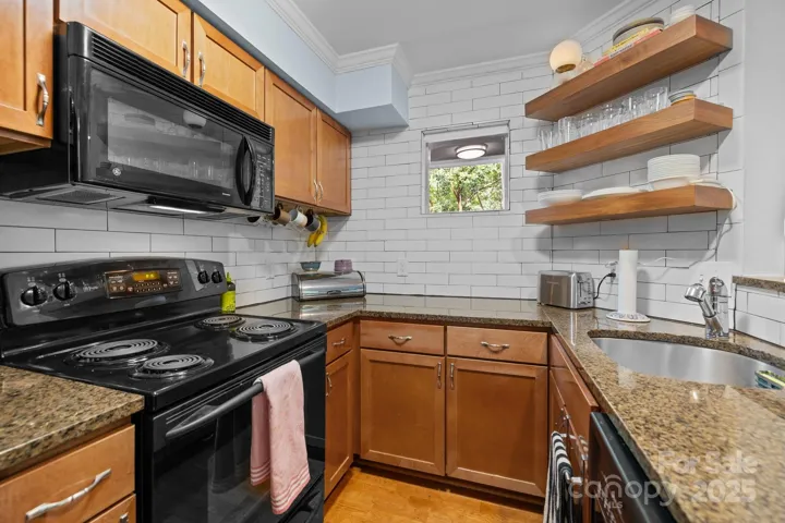 Charming 1-Bedroom Condo in a Prime Charlotte Location! This top-level condo boasts vaulted ceilings & a spacious, open floor plan perfect for entertaining. The kitchen is a showstopper w/ sleek granite countertops, a stylish subway tile backsplash & custom floating shelves that add both function & flair. The owner’s bedroom is a private retreat featuring a spacious walk-in closet w/ built-in shelving for easy organization. Enjoy the comfort of a large bathroom complete w/ a dual sink vanity & a laundry nook tucked away just steps from the bedroom. Relax and enjoy the outdoors on your private patio. With convenient access to nearby shopping, dining & entertainment options, this condo offers both comfort and ease of living. Ideal for first-time homebuyers, downsizers, or investors, this cozy gem offers an excellent opportunity to own in a sought-after location of Villages of Eastover Glen at an affordable price. Don’t miss out on this great find!