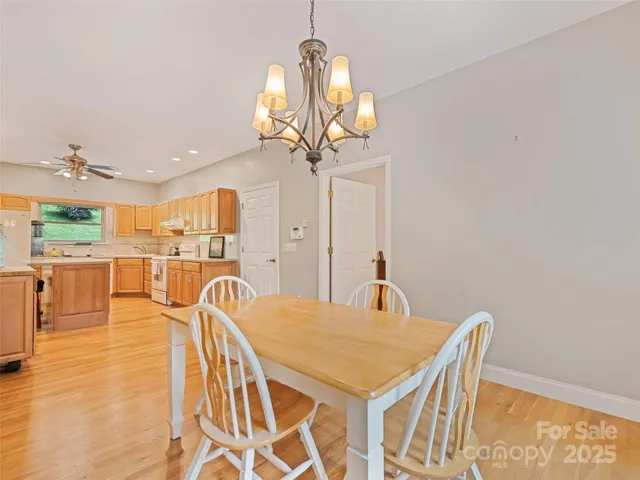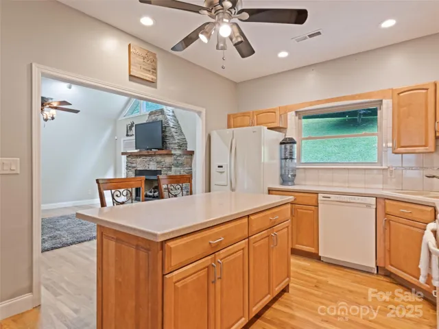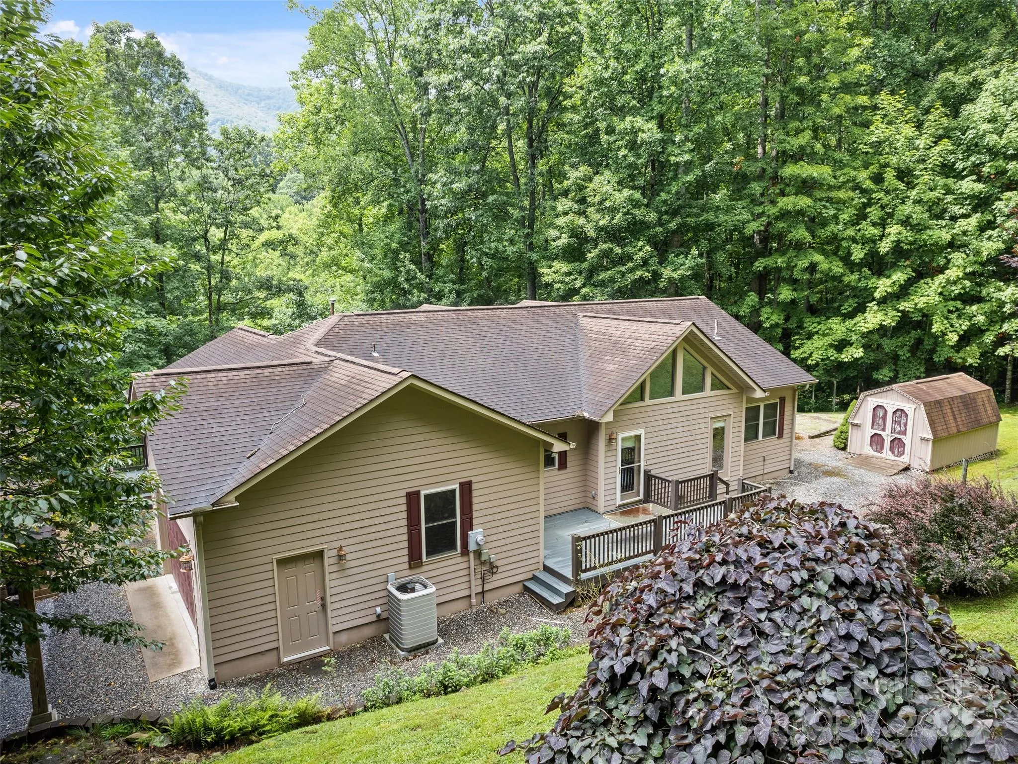 Enjoy privacy and breathtaking mountain views all year round in this custom-built, one-story home from 2005. Blend of modern amenities and rustic mountain charm, this home features 9ft ceilings, oak hardwood floors, exposed beam, vaulted ceiling, open floor plan with a cozy stone fireplace. The kitchen offers an island and breakfast bar with Corian countertops. Primary suite includes a double vanity and a tiled walk-in shower. A split layout places two bedrooms and a full bath on the opposite side. Views showcase Cataloochee Ski Slopes. Paved access leads you right to the home. A well-maintained community with a low $400/yr HOA fee and Fiber Optic Internet. It also boasts a 2-car garage, a 2-car carport, and ample driveway space for parking and easy turnarounds. Additional storage is available in the shed, and the lush landscaping includes black raspberries, strawberries, and blueberries. A year-round creek runs through the property, and lots of wildlife! No Rentals Allowed.