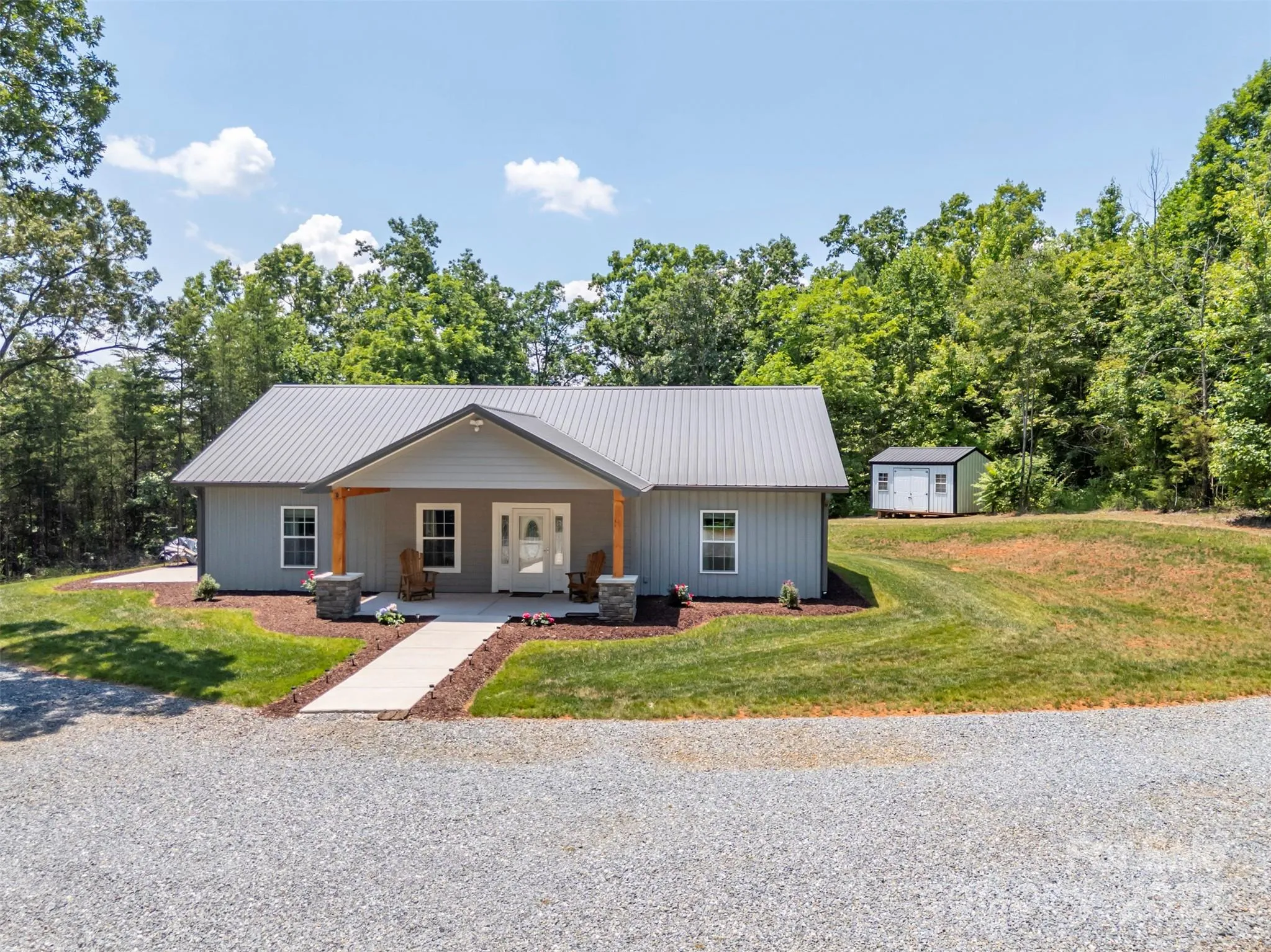 Custom-built, one-owner 3BR/2BA home on 4.57 private, beautifully landscaped acres in Rutherfordton. Features open floor plan with walnut and tile flooring, 10’+ ceilings, and split-bedroom layout. Spacious primary suite offers walnut floors, tile shower, and private patio access. Additional bedrooms share a tiled bath with walk-in shower. No-step entry, covered front and back porches, and detached storage building add convenience. Built for low maintenance with metal roof and siding, 8” exterior walls, and interior soundproof insulation. Quality construction throughout with thoughtful upgrades. Detailed upgrade list available upon request. A peaceful, private retreat just minutes from town—move-in ready!
